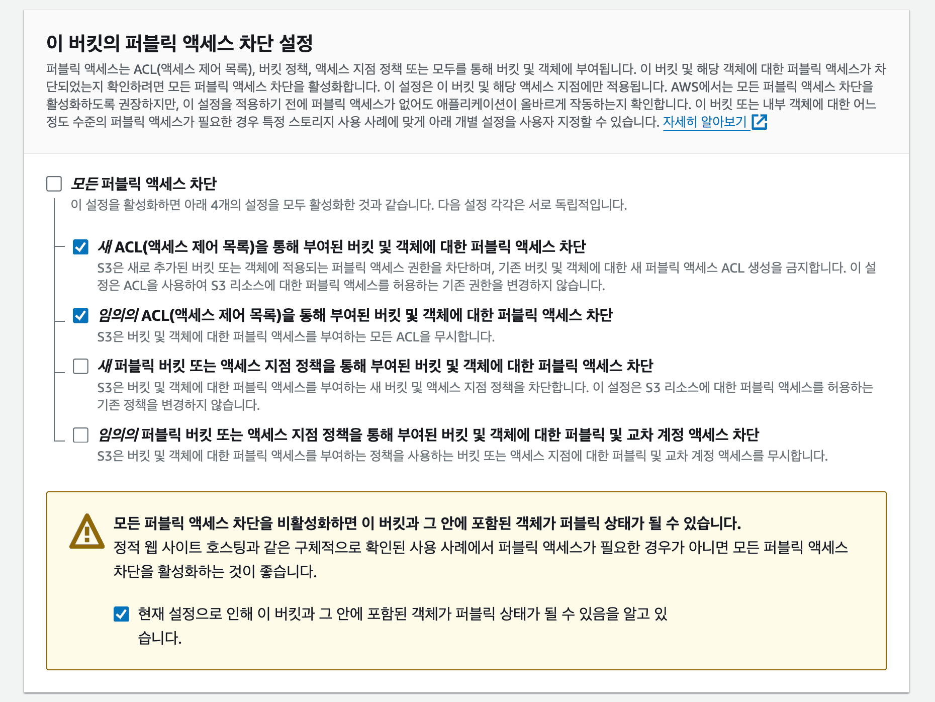 앞서, 버킷 정책을 통해 권한을 설정하기 위해서는 버킷 정책이 적용하는 퍼블릭 액세스 차단을 해제해야 합니다.